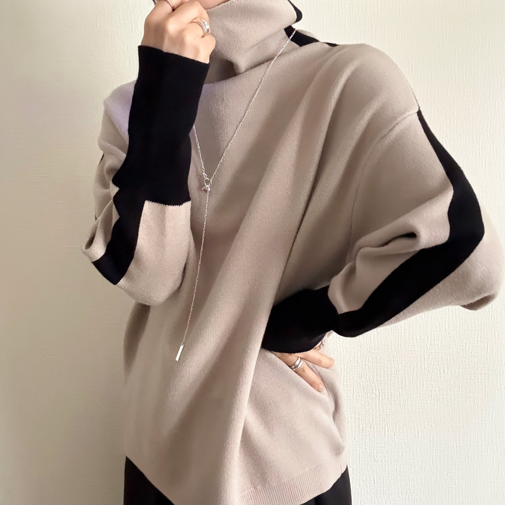 配色ラインがポイントのハイネックニット。