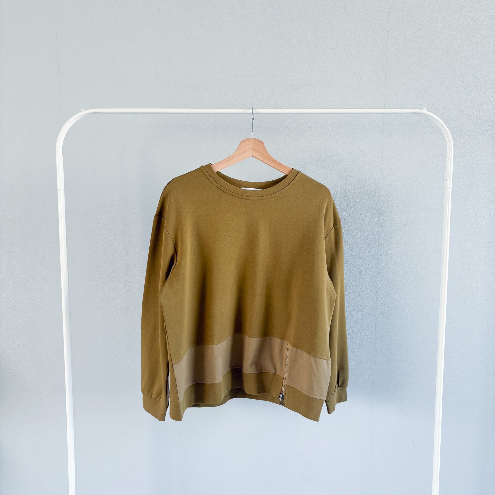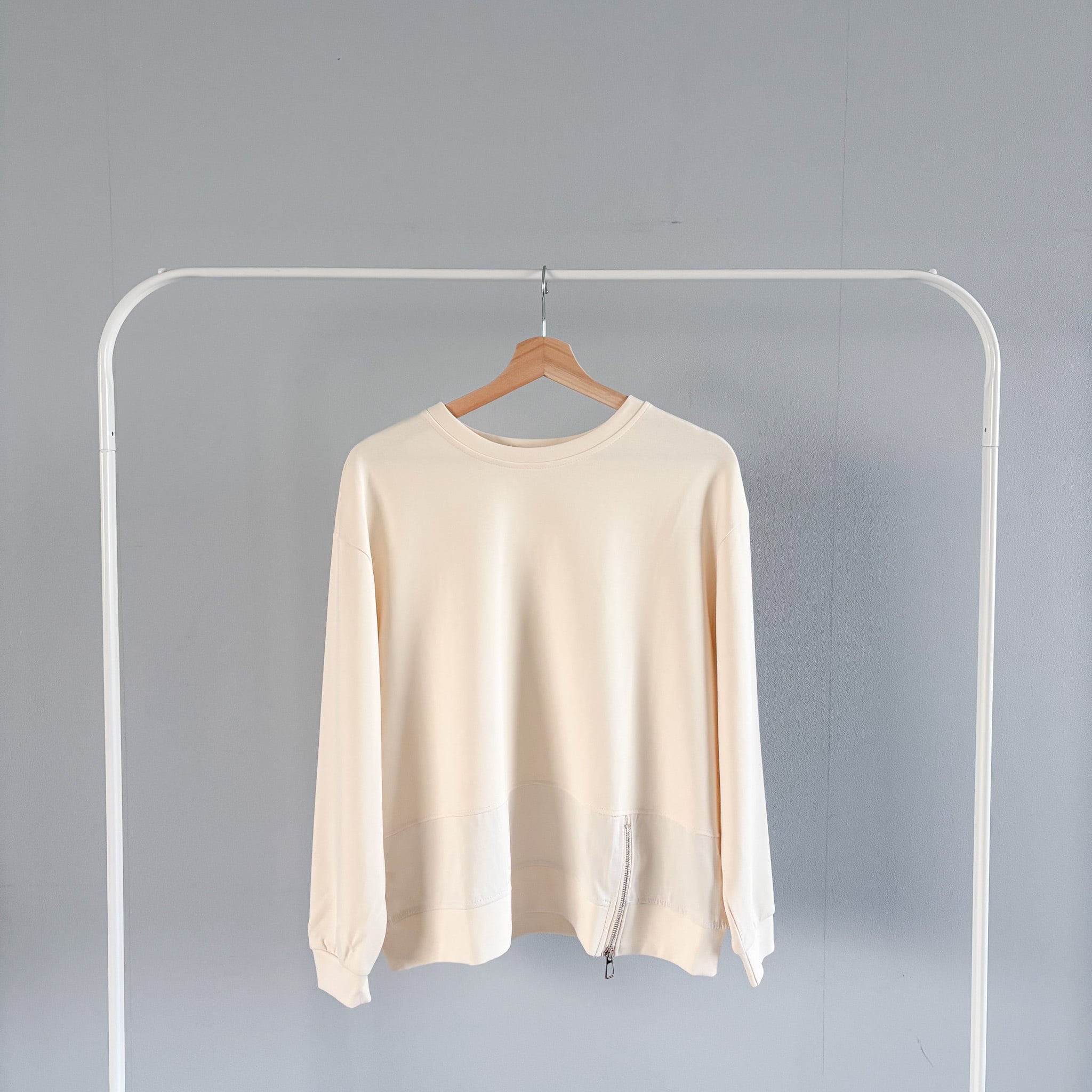 裾のファスナーと異素材使いが、さりげない個性を演出。
